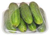 Packaged and labeled fresh zucchini on isolated white background