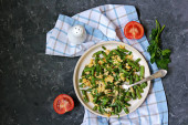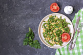 A healthy salad of fresh spinach, fried mushrooms and a boiled egg on a ceramic plate on a light background. Salad recipes. Healthy food