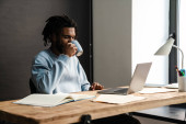 african american man with vitiligo reading newspaper near laptop and blurred flip chart in office
