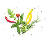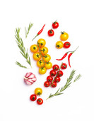 Spicy herbs and vegetables. Tomato, basil, rosemary, pepper, garlic on white background. Cooking concept, top view, copy space