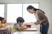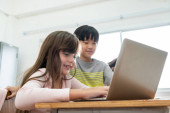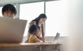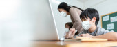 Zdjęcie "Azji kobieta nauczyciel jest nauczania i porady mały chłopiec uczenia się na laptopie komputera w szkole." może być wykorzystywane do celów osobistych i komercyjnych zgodnie z warunkami zakupionej licencji Royalty-free. Obraz jest dostępny do pobrania w jakości wysokiej rozdzielczości do 5760x3840.