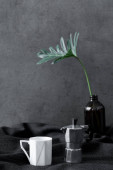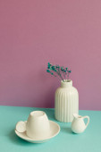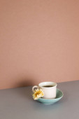 Cup of tea and vase of pink dry plant on gray table. brown wall background