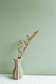 Vase of pink dry plant on gray table. brown wall background. home decor interior