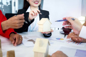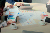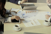 Hand of business man holding a pan while sitting at meeting table in office together with his colleague team, taking a short note and writing on paper during brainstorming meeting