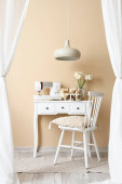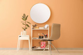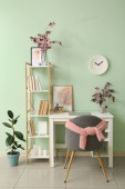 Wnętrze stylowego pokoju z różowym fotelem, złotą lampą i zieloną ścianą