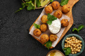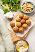 Tradycyjny orientalny ciecierzyca smażony falafel na desce drewnianej, tzatziki sos jogurtowy, hummus, świeże limonki i zielone kolendry na jasnej powierzchni, przestrzeń do kopiowania
