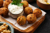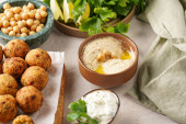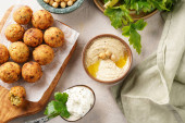 Zdjęcie "Tradycyjny orientalny ciecierzyca smażony falafel na desce drewnianej, tzatziki sos jogurtowy, hummus, świeże limonki i zielone kolendry na jasnej powierzchni, przestrzeń do kopiowania dla tet" może być wykorzystywane do celów osobistych i komercyjnych zgodnie z warunkami zakupionej licencji Royalty-free. Obraz jest dostępny do pobrania w jakości wysokiej rozdzielczości do 5760x3840.
