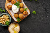 Tradycyjny orientalny ciecierzyca smażony falafel na desce drewnianej, tzatziki sos jogurtowy, hummus, świeże limonki i zielone kolendry na jasnej powierzchni, przestrzeń do kopiowania dla tet