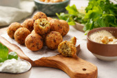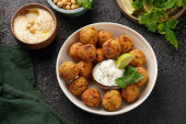 Tradycyjny orientalny ciecierzyca smażony falafel na desce drewnianej, tzatziki sos jogurtowy, hummus, świeże limonki i zielone kolendry na jasnej powierzchni