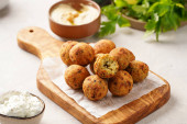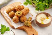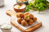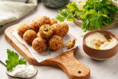 Zdjęcie "Tradycyjny orientalny ciecierzyca smażony falafel na desce drewnianej, tzatziki sos jogurtowy, hummus, świeże limonki i zielone kolendry na jasnej powierzchni" może być wykorzystywane do celów osobistych i komercyjnych zgodnie z warunkami zakupionej licencji Royalty-free. Obraz jest dostępny do pobrania w jakości wysokiej rozdzielczości do 5760x3840.