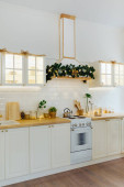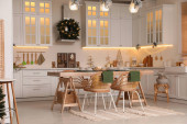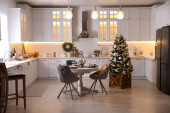 Zdjęcie "Przytulny otwarty plan kuchnia urządzona na Boże Narodzenie. Projekt wnętrza" może być wykorzystywane do celów osobistych i komercyjnych zgodnie z warunkami zakupionej licencji Royalty-free. Obraz jest dostępny do pobrania w jakości wysokiej rozdzielczości do 5760x3840.