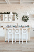 Przytulny otwarty plan kuchnia urządzona na Boże Narodzenie. Projekt wnętrza
