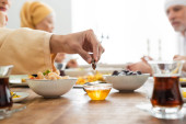 Zdjęcie "przycięty widok na rodzinę muzułmanów w pobliżu stołu serwowane z pilaf, daty, baklava, herbata i miód" może być wykorzystywane do celów osobistych i komercyjnych zgodnie z warunkami zakupionej licencji Royalty-free. Obraz jest dostępny do pobrania w jakości wysokiej rozdzielczości do 5760x3840.