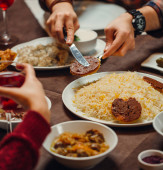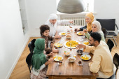 przycięty widok na rodzinę muzułmanów w pobliżu stołu serwowane z pilaf, daty, baklava, herbata i miód