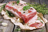 boczek surowy z przyprawami i pomidory na drewnianym stole