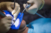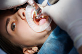 Lekarz dentysta leczy zbliżenia zębów pacjenta, jak prawidłowo dbać o zęby. Opieka stomatologiczna i higiena. Skupienie selektywne.