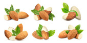 Zestaw smacznych migdałów i świeżych zielonych liści na białym tle