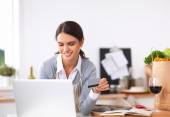 Uśmiechnięta kobieta zakupy online przy użyciu komputera i karty kredytowej w kuchni