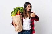 Młody Kaukaski z warzywami odizolowanymi na białym tle świętującymi zwycięstwo