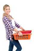 Młoda dziewczyna sortowanie butelek szklanych na białym tle