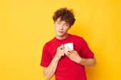facet z czerwonymi kręconymi włosami w fioletowych t-shirtach z grzebieniem odizolowane tło