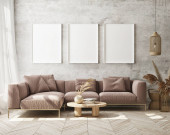 Zdjęcie "Living room interior with brown sofa, coffee table and two picture mock up on warm colored wall. 3D render. 3D illustration." może być wykorzystywane do celów osobistych i komercyjnych zgodnie z warunkami zakupionej licencji Royalty-free. Obraz jest dostępny do pobrania w jakości wysokiej rozdzielczości do 5760x3840.