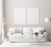 Living room interior with brown sofa, coffee table and two picture mock up on warm colored wall. 3D render. 3D illustration.