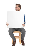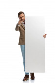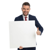 handsome businessman giving a thumbs up and holding his vertical board against white background