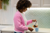 Cheerful millennial pretty black female in apron preparing lunch talk by phone in scandinavian kitchen interior