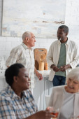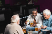Afrykański Amerykanin z piwem rozmawia ze starszymi przyjaciółmi z różnych ras jedząc pizzę w domu