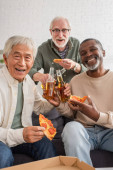 Starszy azjata mężczyzna trzyma piwo i wskazuje palcem blisko międzyrasowych przyjaciół jedzących pizzę w domu