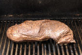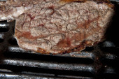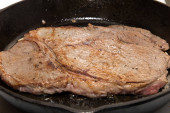 Zbliżenie mięsa ze steku wołowego grillowanego w żeliwnej patelni na gazie.
