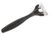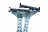 Zamknij, Przednia strona podwójnego ostrza z golarką taśmową lub maszynką do golenia izolowaną na białym tle