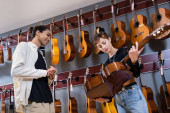 Zdjęcie "Uśmiechnięta Afroamerykanka gra na syntezatorze w pobliżu laptopa i chłopaka z gitarą akustyczną w salonie " może być wykorzystywane do celów osobistych i komercyjnych zgodnie z warunkami zakupionej licencji Royalty-free. Obraz jest dostępny do pobrania w jakości wysokiej rozdzielczości do 5760x3840.