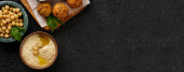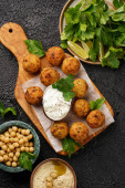 Tradycyjny orientalny ciecierzyca smażony falafel na desce drewnianej, tzatziki sos jogurtowy, hummus, świeże limonki i zielone kolendry na czarnej powierzchni, przestrzeń do kopiowania
