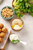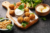 Zdjęcie "Tradycyjny orientalny ciecierzyca smażony falafel na desce drewnianej, tzatziki sos jogurtowy, hummus, świeże limonki i zielone kolendry na czarnej powierzchni, przestrzeń do kopiowania" może być wykorzystywane do celów osobistych i komercyjnych zgodnie z warunkami zakupionej licencji Royalty-free. Obraz jest dostępny do pobrania w jakości wysokiej rozdzielczości do 5760x3840.