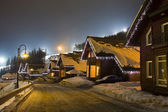 Zimowa noc Bożego Narodzenia widok Porvoo, Borga, Finlandia, Uusimaa, ze śniegiem pada i światła uliczne, z wieczorem Boże Narodzenie oświetlenie nowego roku, drewniane domki