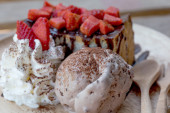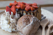 Pieczony chleb z lodami czekoladowymi i truskawkami. Zamknij się.