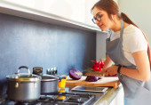 Piękna młoda kobieta gotowanie w kuchni w domu
