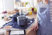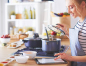 Piękna młoda kobieta gotowanie w kuchni w domu