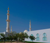 DUBAI, Zjednoczone Emiraty Arabskie - GRUDZIEŃ 24, 2004: Człowiek przechodzący obok meczetu Jumeirah w Dubaju, Zjednoczone Emiraty Arabskie.
