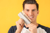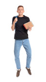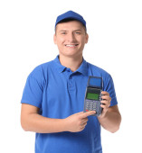 Przystojny młody człowiek wskazujący na kalkulator na białym tle