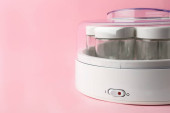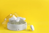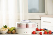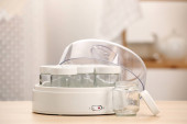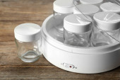 Nowoczesny jogurt i słoiki na drewnianym stole w kuchni