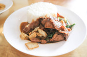 wieprzowina duszona, wieprzowina z ryżem i sosem lub ryż z wieprzowiną i warzywami