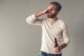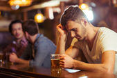 Smutne, młody człowiek w biały t-shirt jest patrząc na szklance piwa siedząc w kontuarem w pubie, w tle dwóch innych mężczyzn