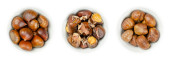 Orzeszki makadamia, w białych miskach. Suszone owoce ze ściętymi orzechami, otwierane kluczem otwierającym, łuskane i surowe, prażone i solone. Znany również jako Queensland, krzak, maroochi, bauple i orzechy hawajskie.