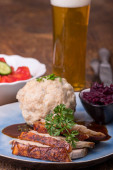 niemiecki sauerbraten z pierogiem ziemniaczanym na drewnie