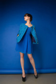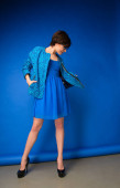 Pinup girl żelazka jej kropkowaną sukienkę i szczęśliwy uśmiech. Retro portret młodej wesołej kobiety w stylu pin-up, vintage stylizacji, studio strzał na białym tle.