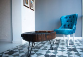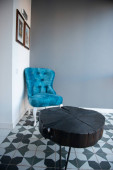 Zdjęcie "Vintage pokój ze staromodnym fotelem, retro radio gramofon, telefon i standardowa lampa, kot są na wycieraczce. Wnętrze XX wieku, nostalgia" może być wykorzystywane do celów osobistych i komercyjnych zgodnie z warunkami zakupionej licencji Royalty-free. Obraz jest dostępny do pobrania w jakości wysokiej rozdzielczości do 5760x3840.