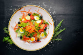 Grecka sałatka z fetą, zieleniną i warzywami na szarym stole